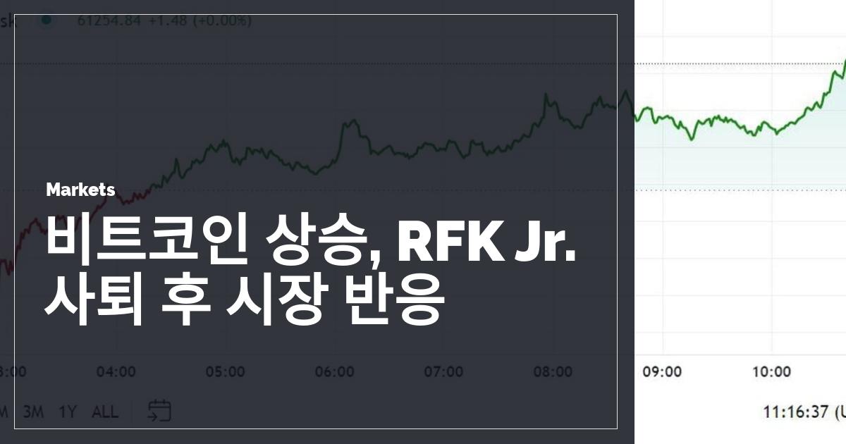 비트코인이 유럽 오전 늦게 급등하여 59,000달러에서 61,000달러 사이를 오르내린 후 약 61,250달러로 상승하며 24시간 동안 약 3% 증가했습니다. 일부 언론은 수요일 늦게 로버트 케네디 주니어가 이번 주 말까지 미국 대선 레이스에서 철회하고 도널드 트럼프를 지지할 계획이라고 보도했습니다. 트럼프는 당선 시 자신을 친암호화폐 대통령으로 내세우고 있습니다. Polymarket 베팅자들은 철회 가능성을 거의 94%로 보고 있으며, 이는 주 초와 비교해 큰 변화입니다. CoinDesk 20 지수에 따르면, 더 넓은 디지털 자산 시장은 24시간 전보다 약 2.75% 상승했습니다.
